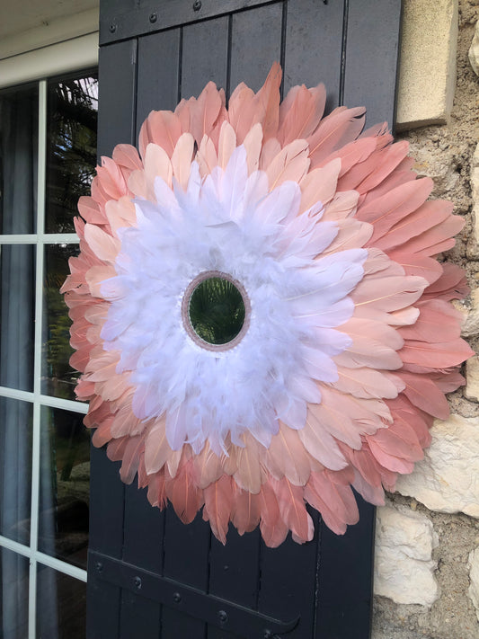 Grand miroir raphia lie de vin et plumes couleur champagne 60 cm