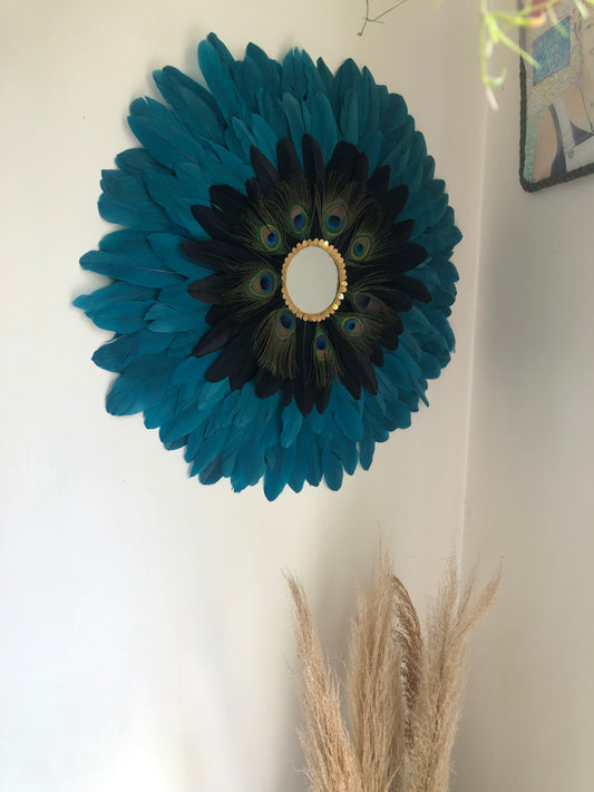 Grand Juju /miroir plumes bleu pétrole, noir et plumes de paon 60 CM