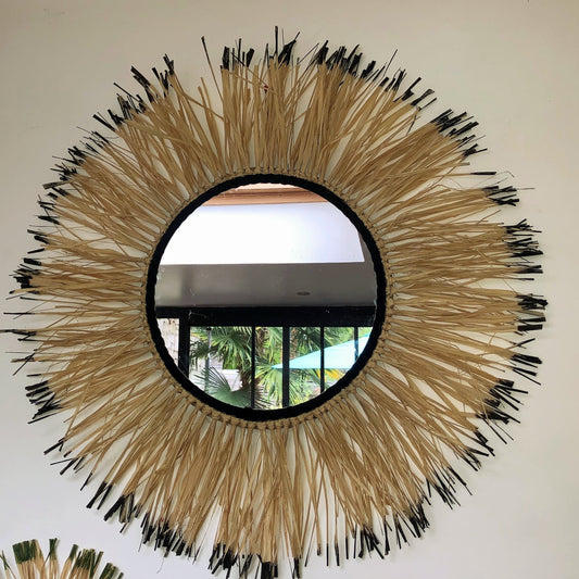 Grand miroir en raphia naturel brun et écru avec perles végétales 50cm