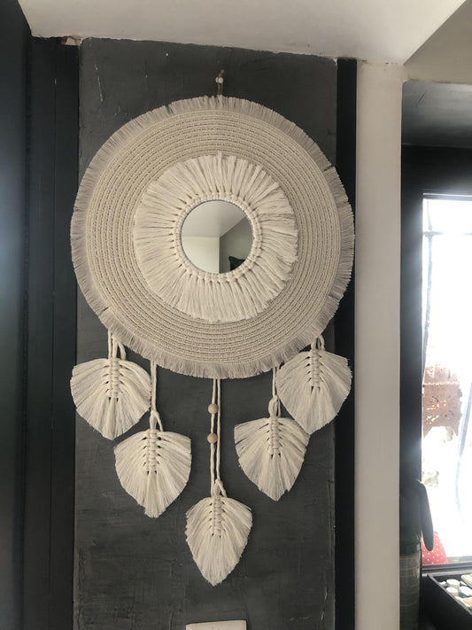 Grand Miroir décoratif raphia et plumes de Paon 65cm