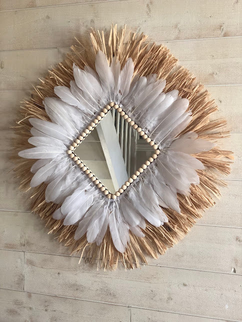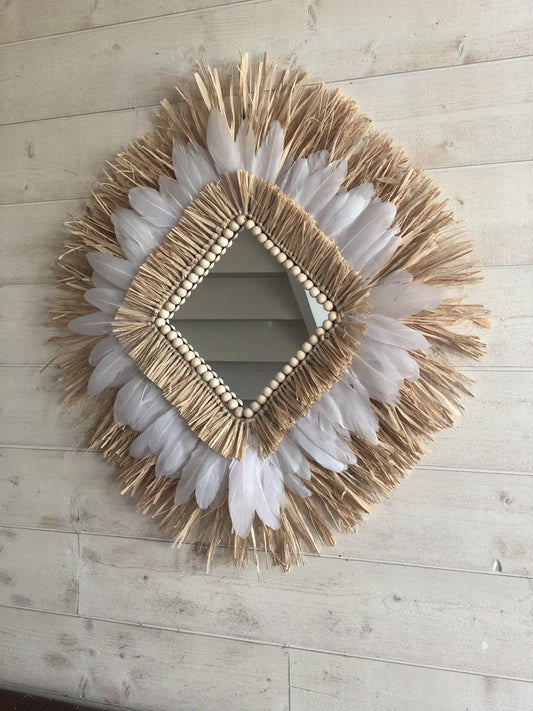 Grand miroir forme losange double raphia et grandes plumes au choix