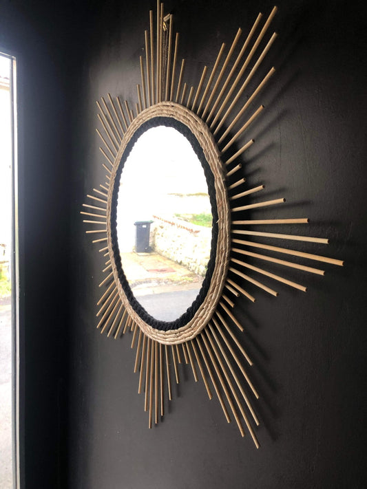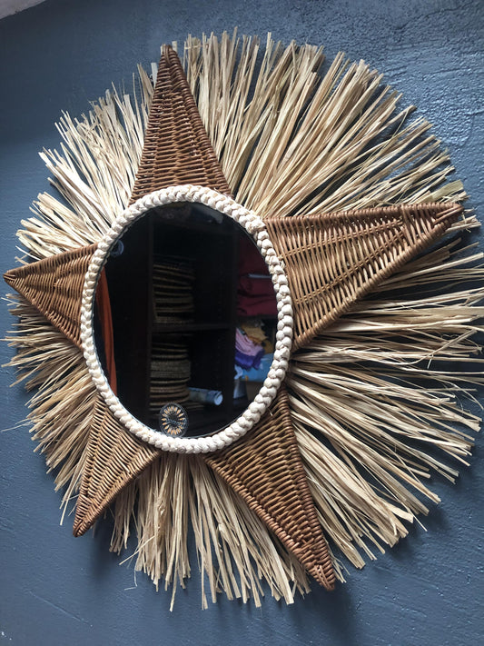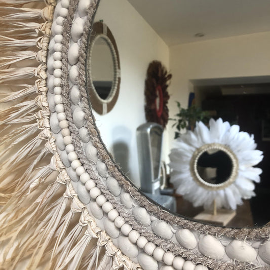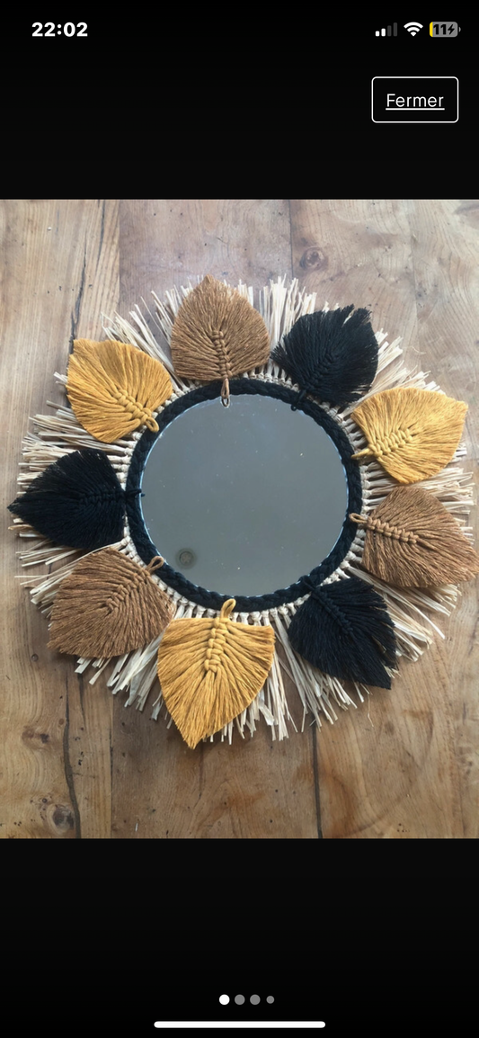 Miroir en raphia naturel et feuilles en coton macramé (différents coloris au choix)