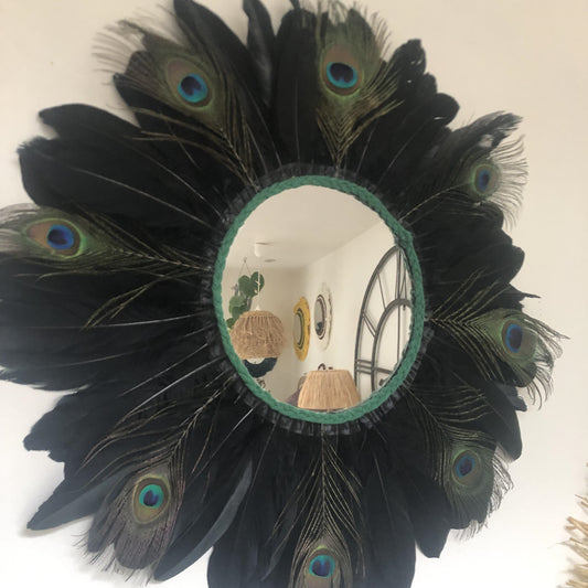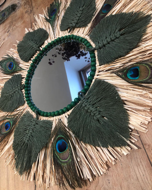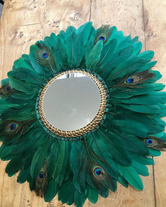 Miroir en rotin et grandes plumes vertes et plumes de paon 60 CM