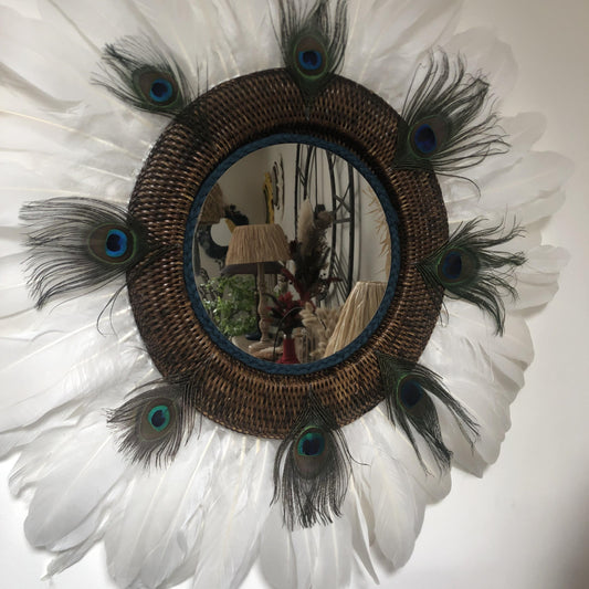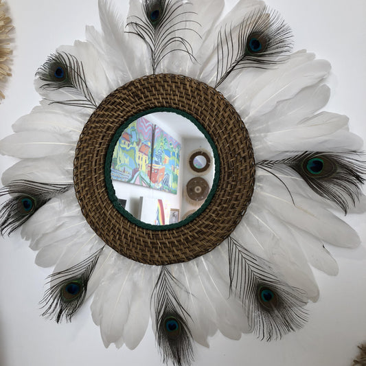miroir en raphia, coton macramé et plumes de paon 50 cm