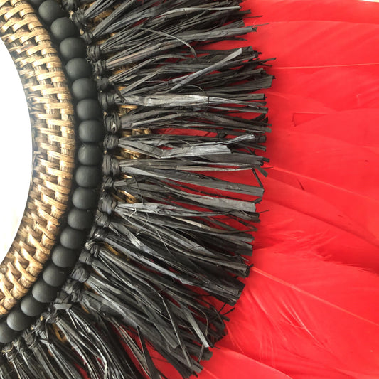 Miroir mural en raphia noir et grandes plumes rouges "coquelicot"