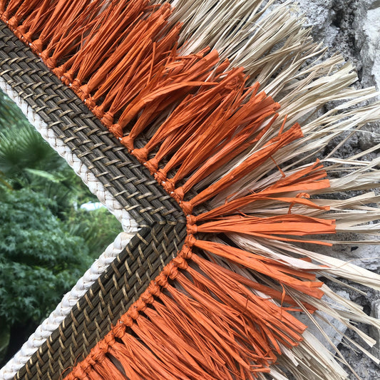 Miroir losange en rotin, raphia naturel orange et écru 50 cm