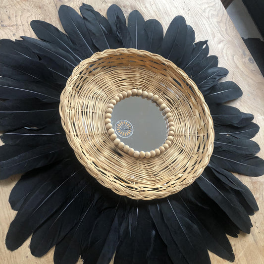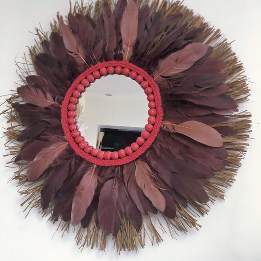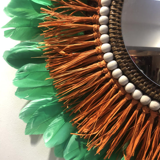 Miroir en raphia ORANGE, perles en bois et plumes (tous coloris)