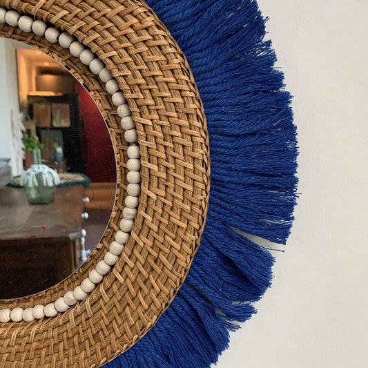 Miroir en rotin, coton macramé peigné et perles bois peintes à la main