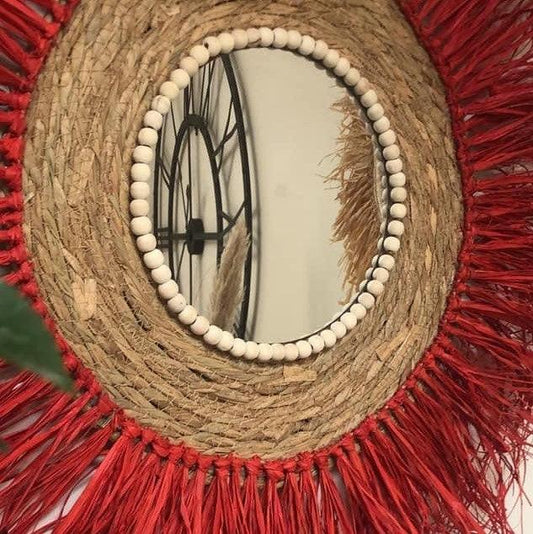 Miroir en rotin, raphia vert et perles rouges 50cm