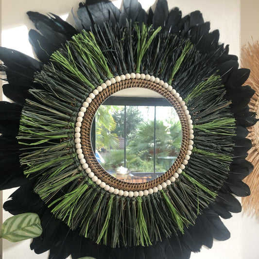 Miroir parfum boisé, raphia vert et plumes aux différents coloris