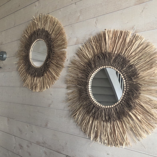 Large mirror in natural brown and ecru raffia with plant beads, 50cm