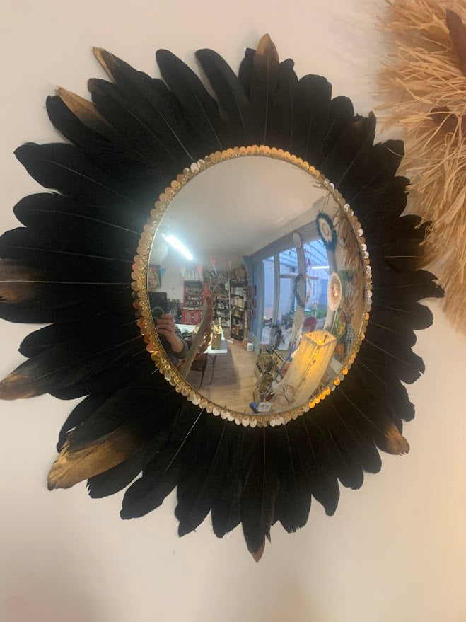 Plongez dans la magie avec ce grand miroir de sorcière aux allures mystérieuses ! Orné de majestueuses plumes noires et rehaussé de délicates dorures, ce miroir de 60 cm devient bien plus qu'un simple accessoire de décoration. Ses lisérés dorés capturent la lumière tandis que les plumes ajoutent une touche de fantaisie et d'enchantement à votre intérieur. Parfait pour les amateurs de décoration bohème, gothique ou simplement magique, il transforme n'importe quel espace en sanctuaire mystérieux. Un véritable grimoire de style !