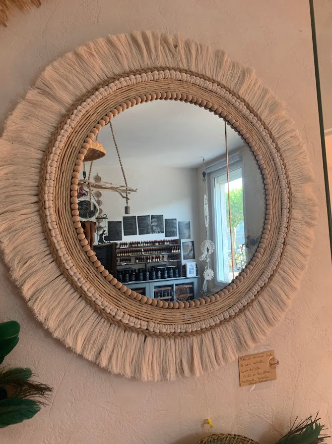 Enhance your home with our extra-large 68cm ecru cotton mirror . Made with natural corn rope and a large 40cm glass panel, this mirror brings a unique touch of softness and harmony to your bohemian decor. An eco-friendly piece in natural tones with ecru macrame, perfect for a charming interior!